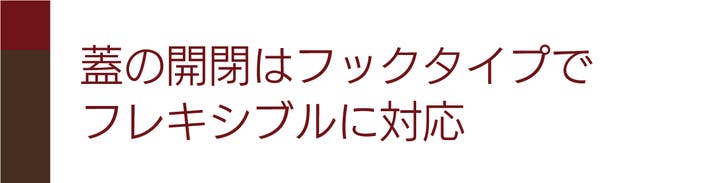 表の蓋のABALLIロゴの横にある突起がツマミになっており、ツマミをぐいっと起こすと裏側のフックパーツが立ち上がり、本体側のフック通しに引っ掛けるという仕組みです。