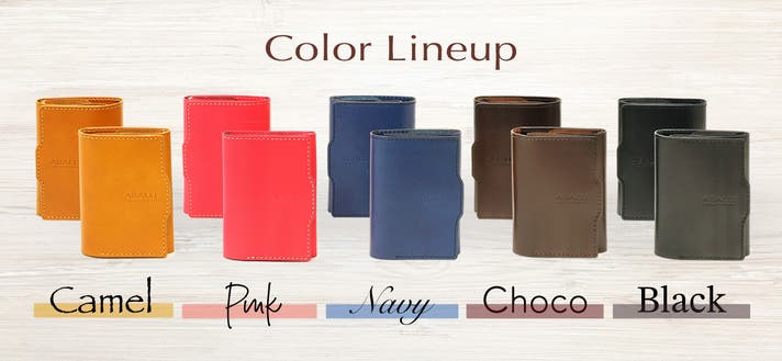 ピンク以外のキャメル、ネイビー、チョコ、ブラックの4色がオイルレザーでしっとりとした手に馴染む質感で高級感があり、経年変化で色ツヤが深まっていきます。