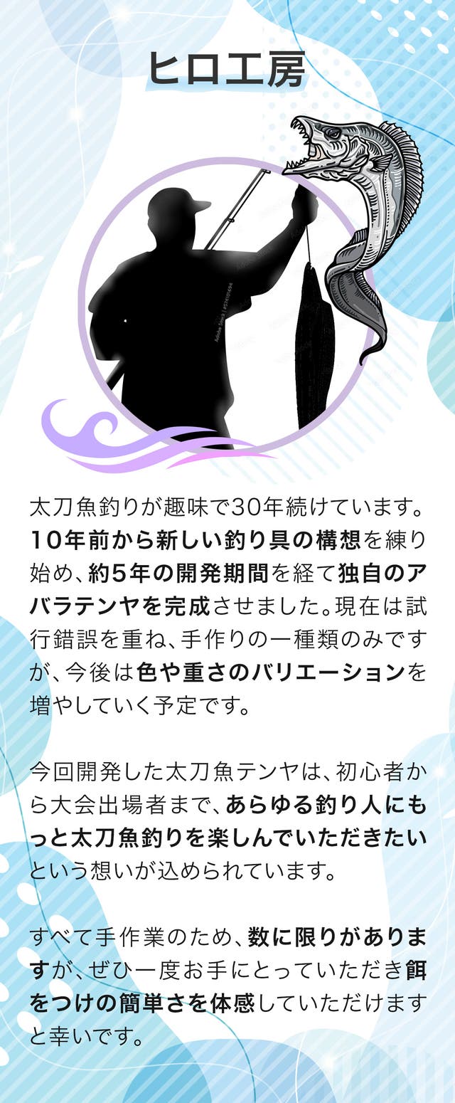 すべてが手作業なので、数に限りがありますが、一人でも多くの人にもっと太刀魚釣りを楽しんでいただけたらと思い、改良に改良を重ねました!