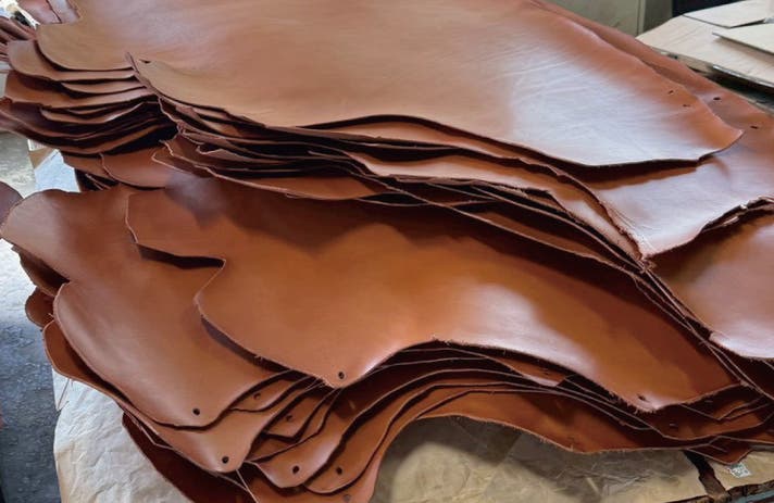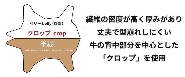 ゆるみを解消するため、本プロジェクトでは繊維の密度が高く厚みがあり、丈夫で型崩れしにくい牛の背中部分を中心とした「クロップ」を使用しています。