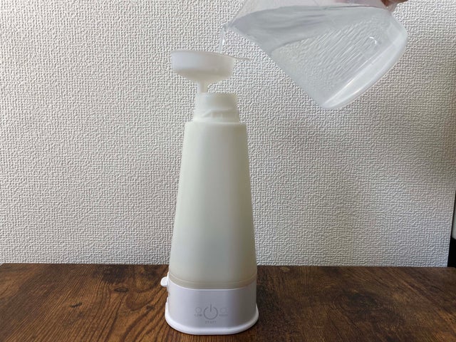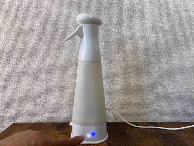 ③食塩水を入れ、スプレーキャップを閉めて真ん中のボタンを押します
