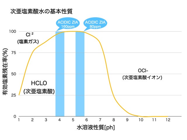PH5前後(PH3.0~7.0)で生成した次亜塩素酸水が、最も多くの次亜塩素酸を