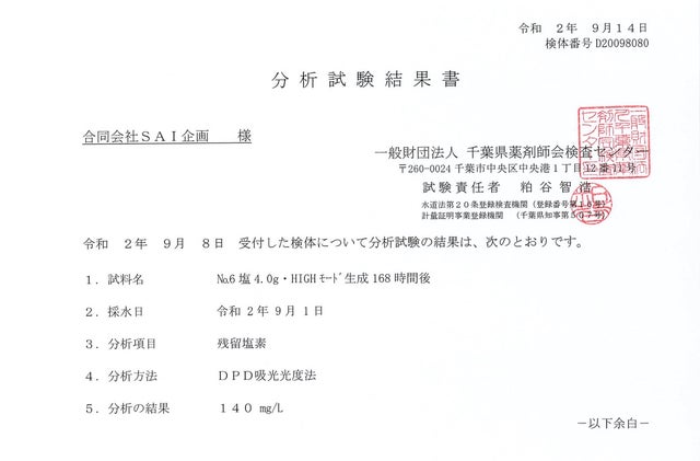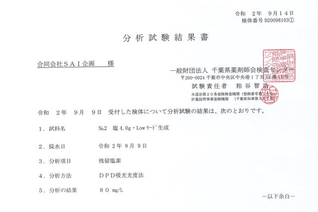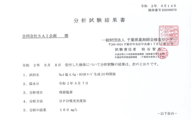弊社では、生成された次亜塩素酸水を国内の検査機関にて成分検査を受けております