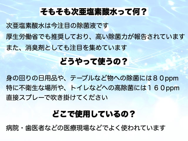 微酸性・弱酸性の次亜塩素酸水の効果は、厚労省・NITE ・その他の研究機関により除菌対策として推奨されております。