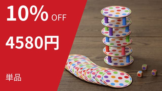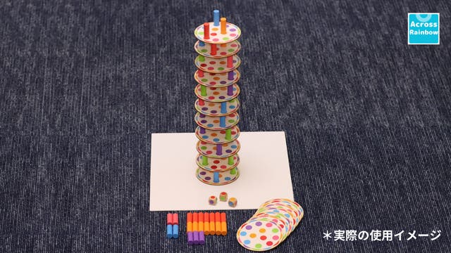 ルール:様々な色が配置されたボードを1枚山から置き、サイコロを3つ同時に振り、出た目と同じ色のブロックをボード上にある同じ色のマスに置きます。 次の人はボードを重ねてブロックを立てていきます。 これを繰り返し、ブロックの山を崩してしまった人の負けです。