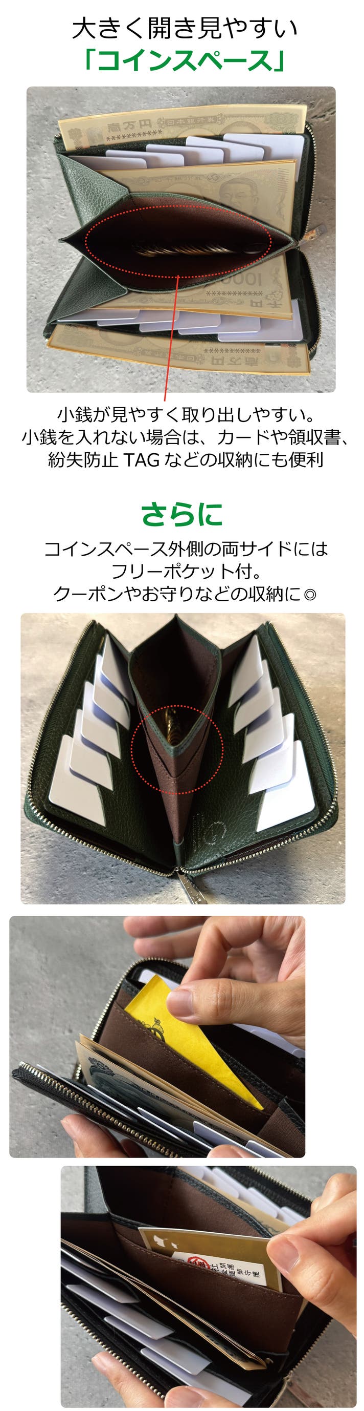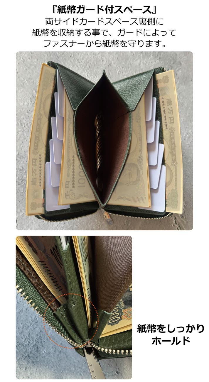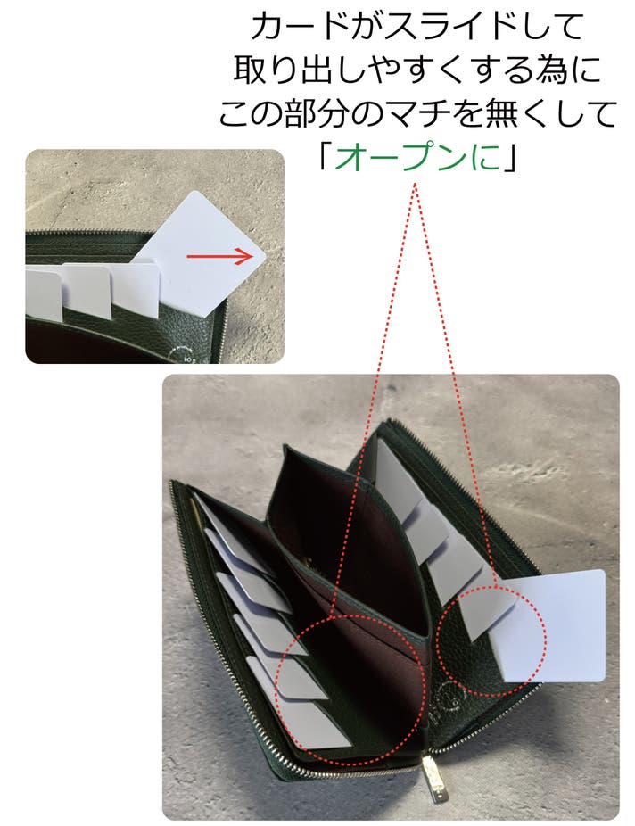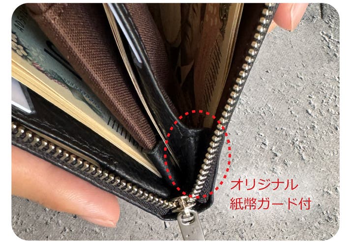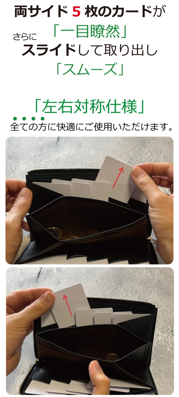 - カード10枚が見やすく美しく整列。弊社考案のガード付き仕様でファスナーが紙幣を噛みづらい。