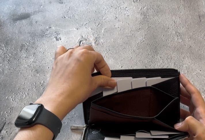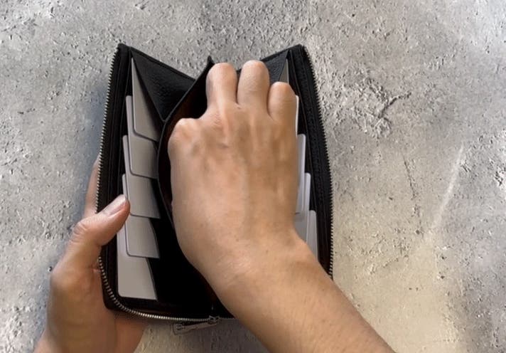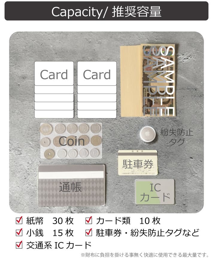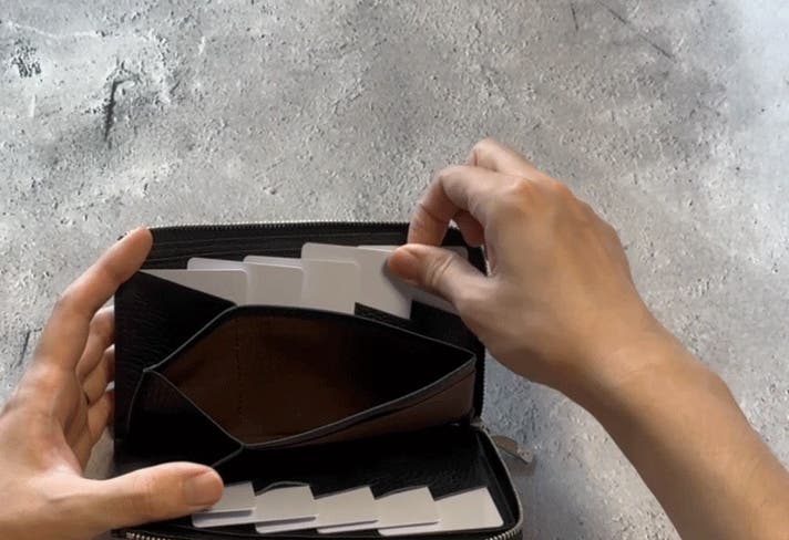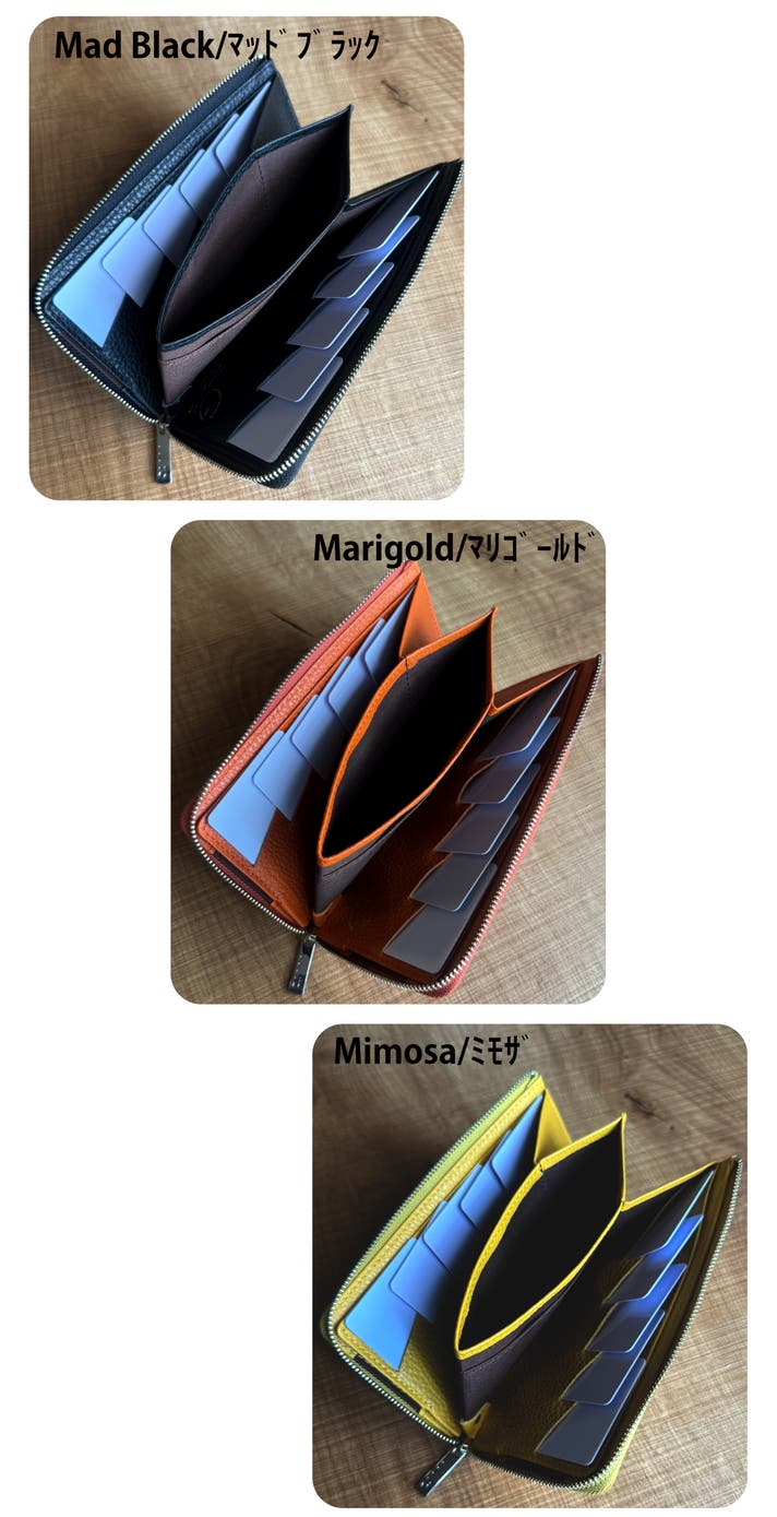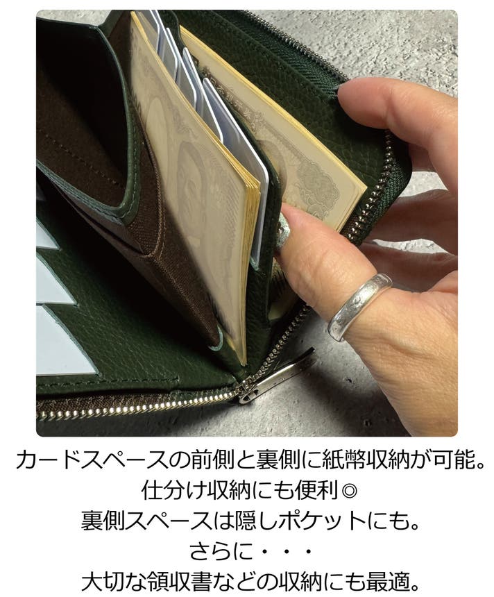 - カード10枚が見やすく美しく整列。弊社考案のガード付き仕様でファスナーが紙幣を噛みづらい。