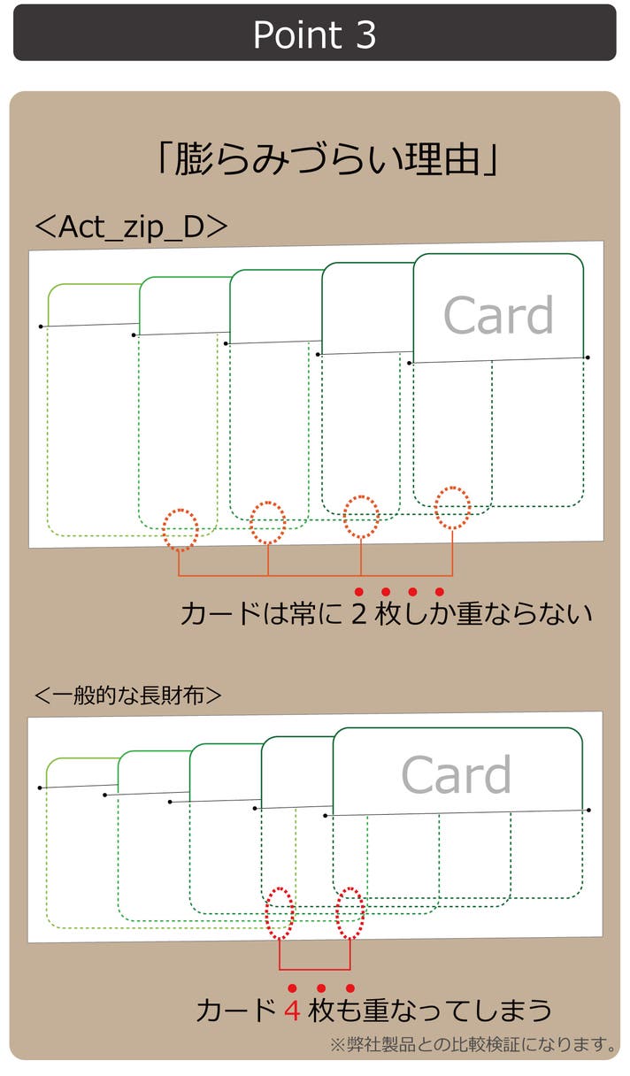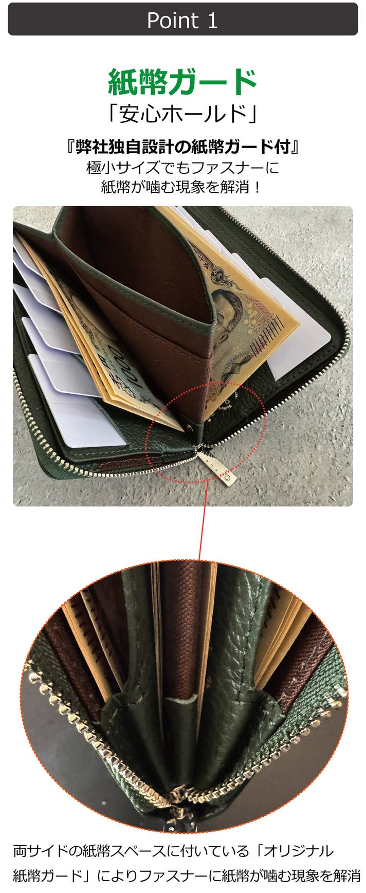 ◇カード10枚が見やすく美しく整列。弊社独自ガード付スペースに収納すればファスナーが紙幣を噛む事を防止。