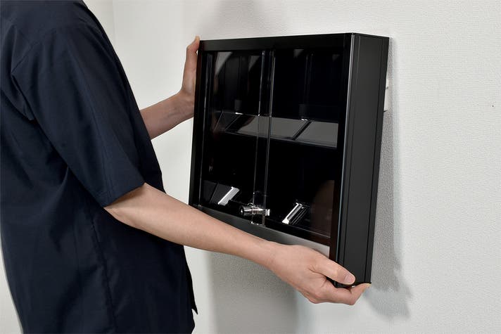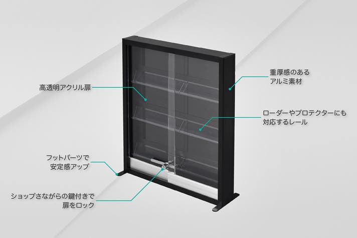 カードショップのショーケース準拠のスペックで作られた本製品は、内部設計やフレーム、施錠仕様に至るまで、すべて店舗用什器と同等のものを採用しています。