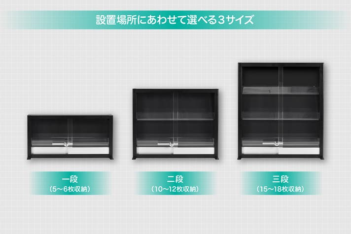 レールの段数が異なる『一段、二段、三段』の3サイズをラインナップ。限られたスペースにさりげなく飾るスタイルから、大切なコレクションを一堂に並べるダイナミックな展示まで。用途や設置場所に応じて、お好みのサイズをお選びいただけます。