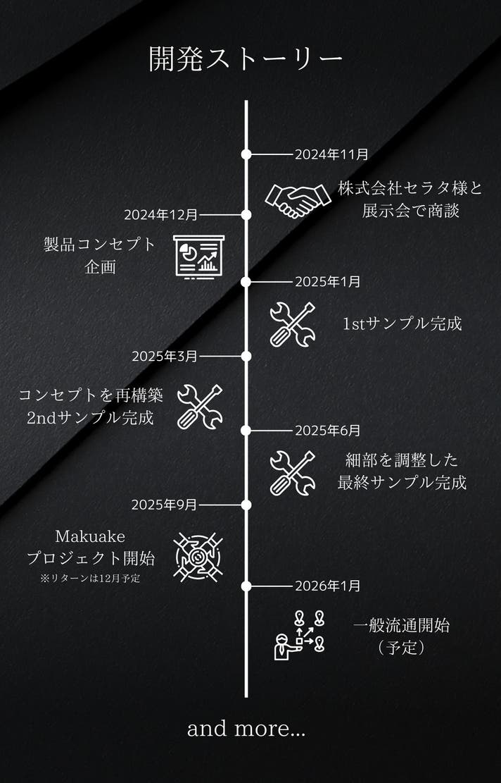 ・使用感等に関する返品・返金はお受けいたしかねます。 ・製造上の都合により製品のサイズや重量には多少のばらつきがございます。 ・画像はイメージです。実際の商品と異なる場合がございます。 ・開発中の製品につきましては、デザイン・仕様が一部変更になる可能性がございます。 ・本プロジェクトを通して想定を上回る皆様から応援購入を頂き、現在進めている環境から量産体制を更に整えることができた場合、正規販売価格が販売予定価格より下がる可能性もございます。 ・本文中に記載させていただいたスケジュールは、あくまでプロジェクト公開時点の予定です。 ・応援購入の性質上、配送遅延のおそれがございます。 ・原則として、配送遅延に伴う応援購入のキャンセルはできませんが、リターン配送予定月から3ヶ月を超えた場合には、希望者に限りキャンセルにて対応させていただきます。 ・記載されている会社名および商品名は、各社の商標または登録商標です。