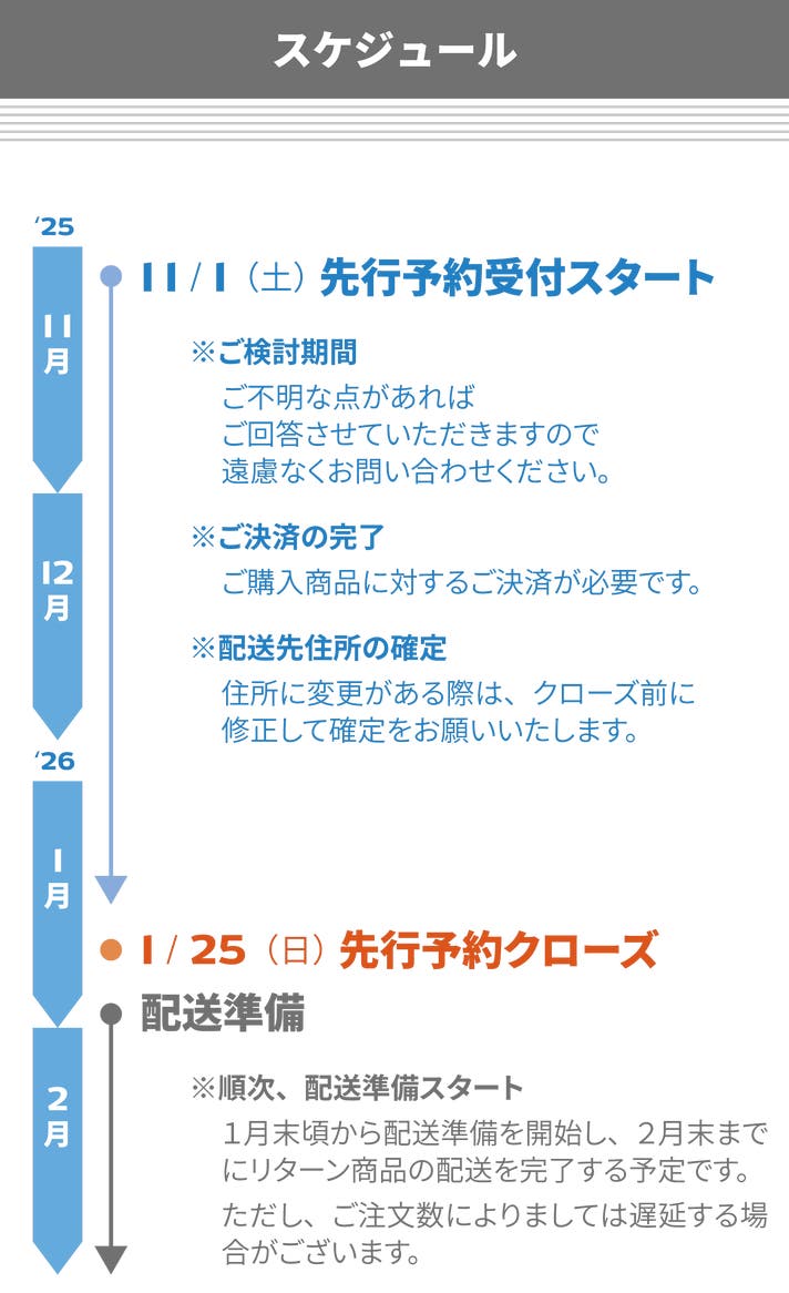 このプロジェクトはAll in型です。目標金額の達成に関わらず、プロジェクト終了日の2026年01月25日までに支払いを完了した時点で購入が成立します。