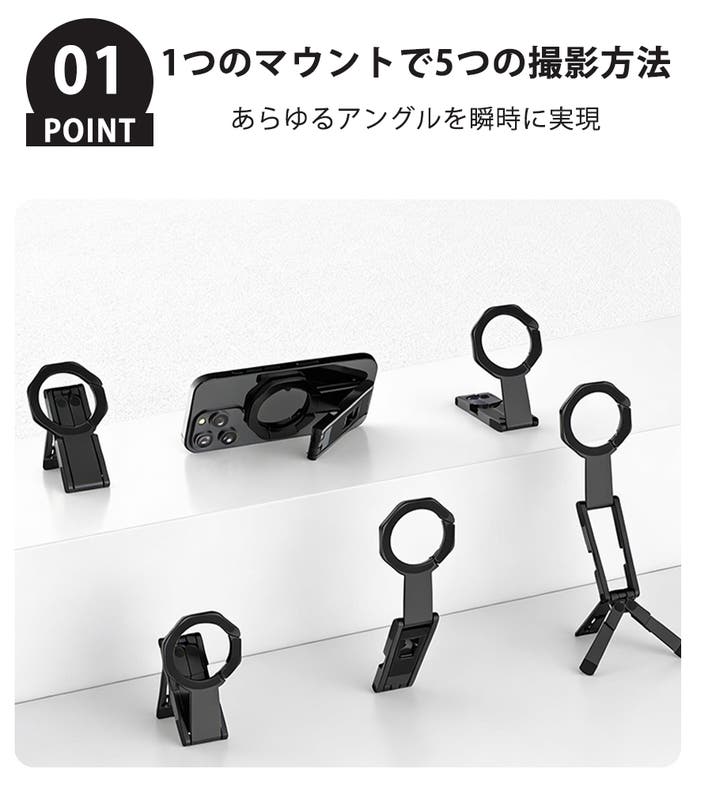 - 【1台5役】三脚・卓上・フック掛け・マグネット・手持ち、これ1台で5つの撮影スタイルを実現。