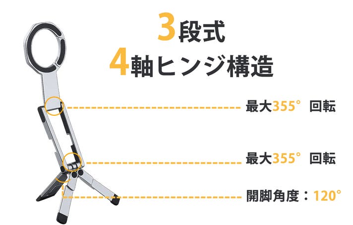 3段式・4軸ヒンジ構造により、自由自在に角度調整が可能。
