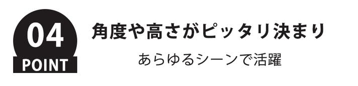 角度や高さの調整が自在で、撮影やオンライン会議、動画配信など、さまざまなシーンに対応します。微妙な傾きも簡単に調整でき、水平・垂直のどちらでも正確に位置を固定。机上や棚の上、床置きなど、置き場所を選ばず活用できます。