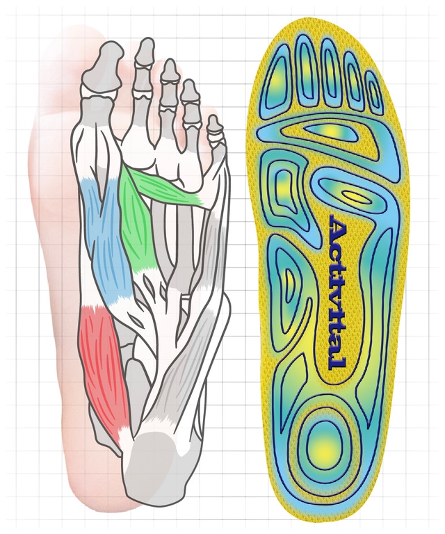 Activitalの看板商品「フットサポーター」シリーズにプリントされている解剖学ゴリラグリップラバー。断熱インソールにはデザインを変えたゴリラグリップラバーがプリントされています。
