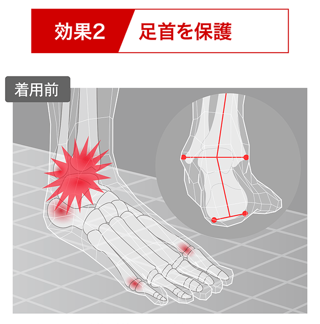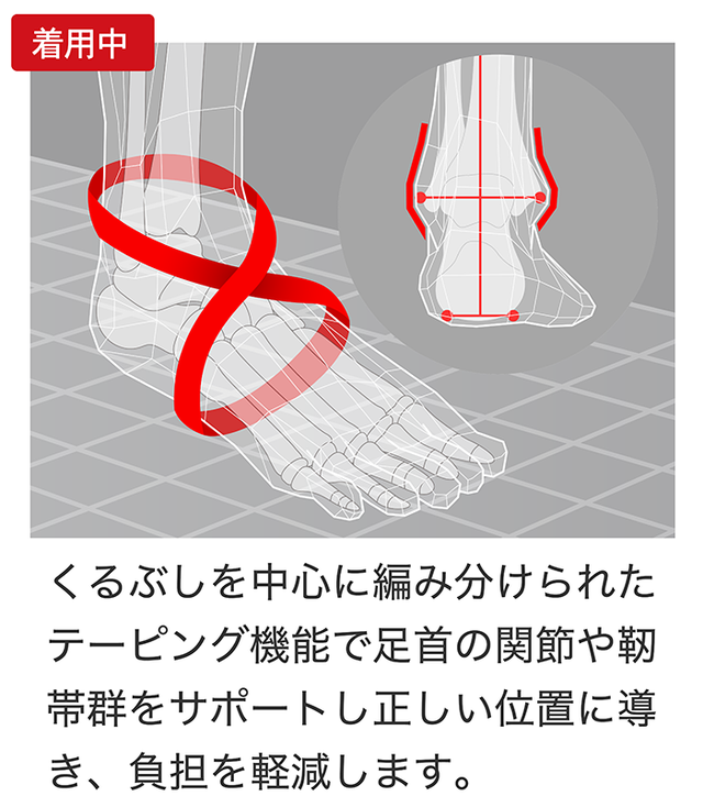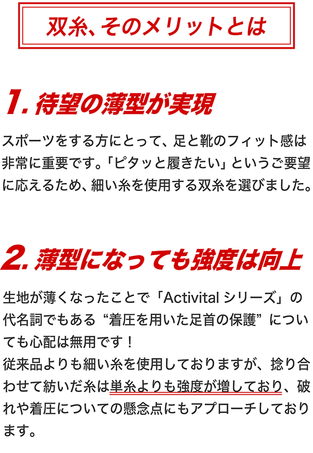 - 双糸という2本の糸を捻り作られた糸で編まれたソックスは薄さを保ちながら足首保護を強化!