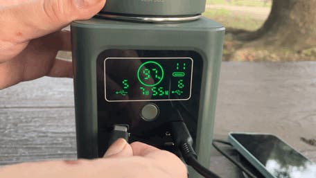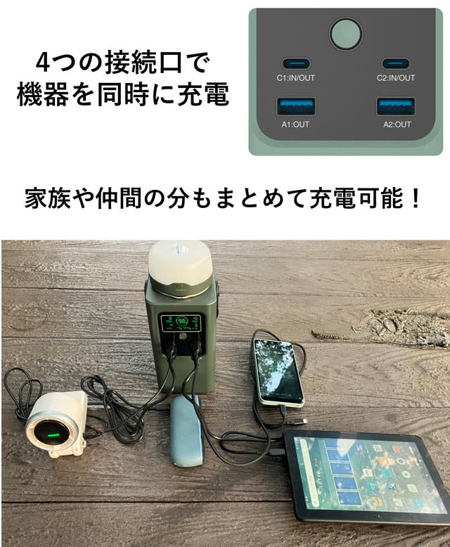 - Type-C、USB各2ポート搭載。出力W数と残り時間表示で、効率よく充電が可能。