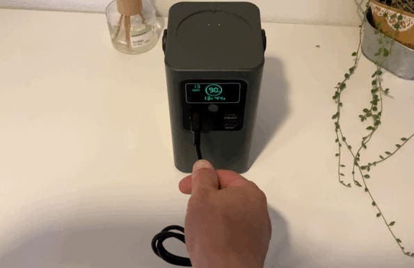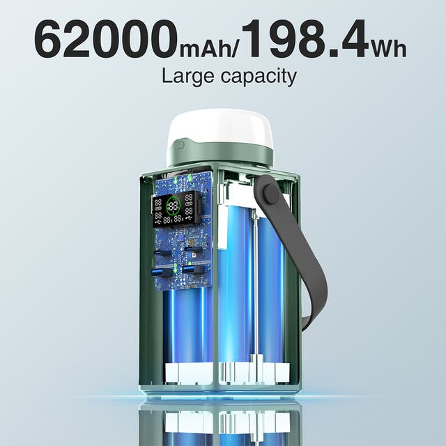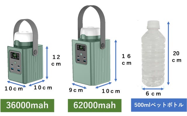 ポータブル電源と一般的なモバイルバッテリーの中間に位置する製品として、バッテリー容量を198Wh(62,000mAh)とし生産。サイズ感はマグボトルサイズに抑え、重さは約1.4㎏で持ち運びも楽な製品です。