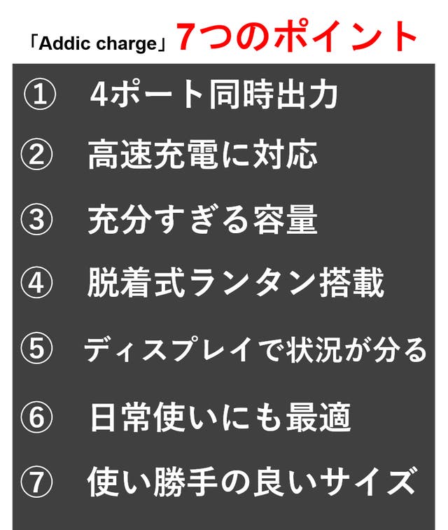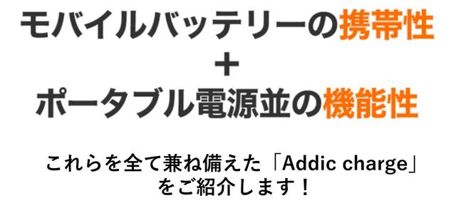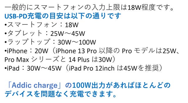 アウトドアバッテリーには珍しく「Addic charge」はPDで100W,QC(クイックチャージ)で18Wの高速充電に対応しています。