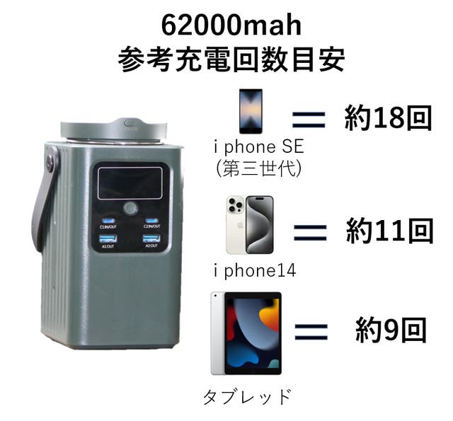 一口に62000mAhといってもピンとこない方も多いと思いますが、一般的なスマートフォンなら21回充電、ノートパソコンなら14時間稼働、電気毛布で8時間使えるというイメージです。