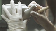 ファインボーンチャイナの素材で缶詰の形状に作り上げた器に、ハンドペイントを施します。