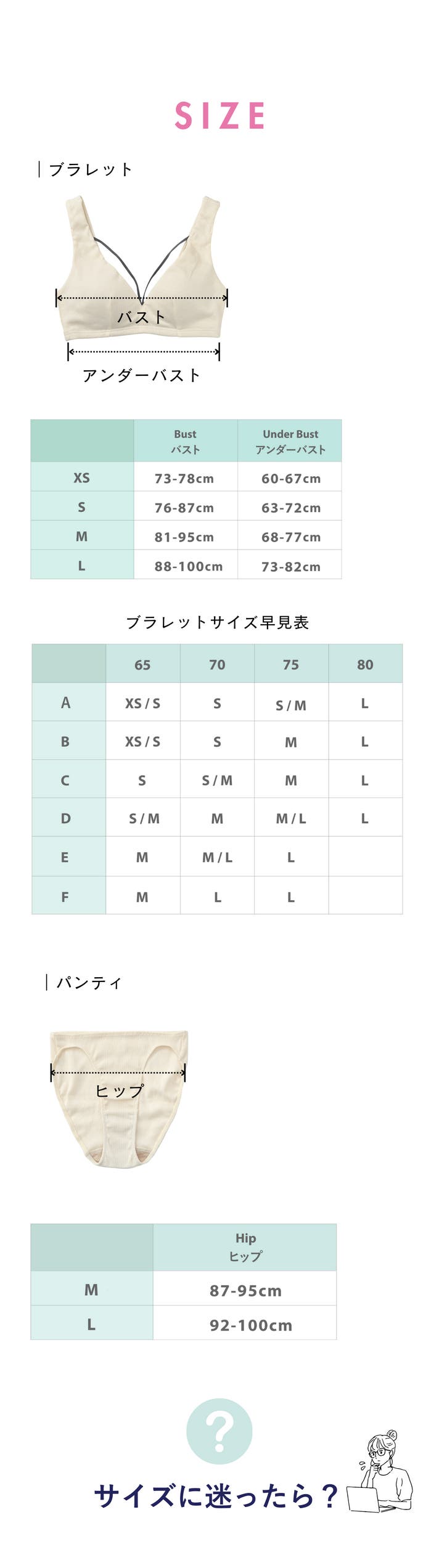 M:バスト(ヌードサイズ)81-95cm、アンダーバスト68-77cm