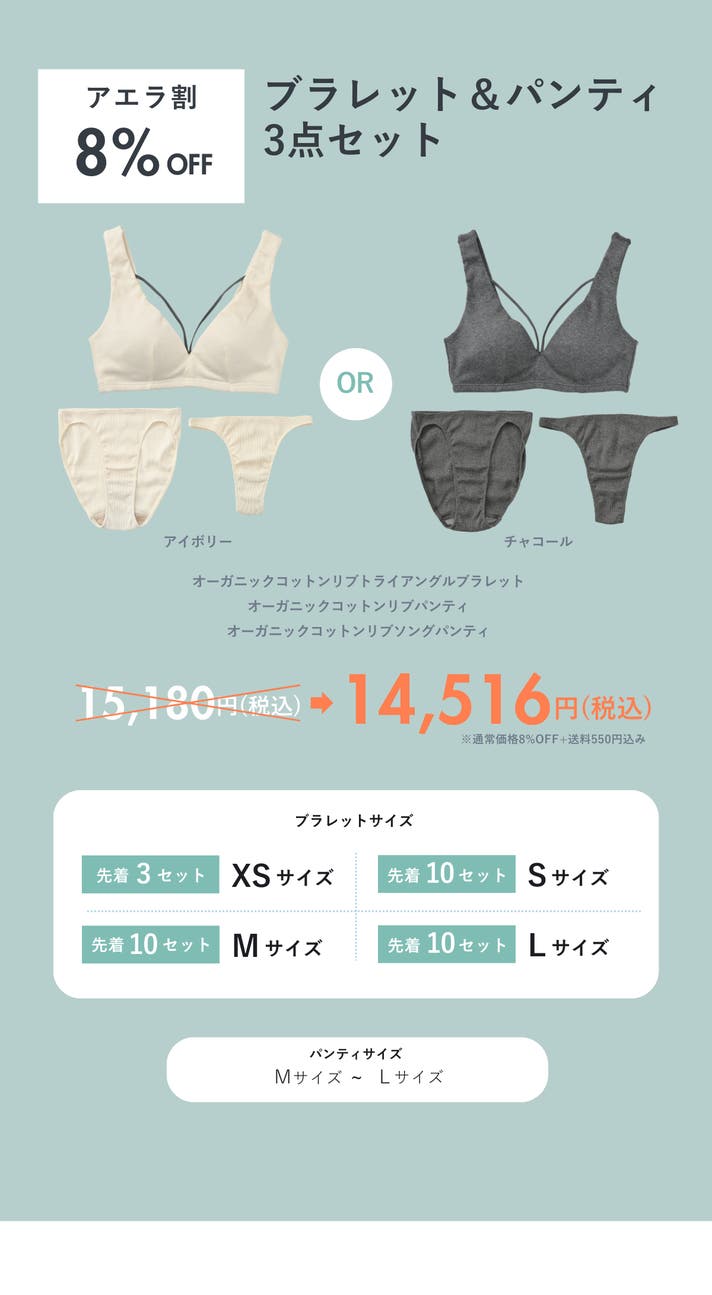 【アエラ割8%OFF】ブラレットXSサイズ&パンティアイボリー3点セット