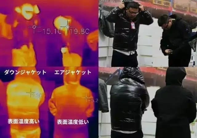 -20℃の環境下で1分間の放熱検証(保温性)について比較しました。ジャケットを着る前は両者ともジャケットの外側の温度は同じでしたが、1分後エアジャケットの表面温度は低く身体から熱が逃げていない事がわかります。