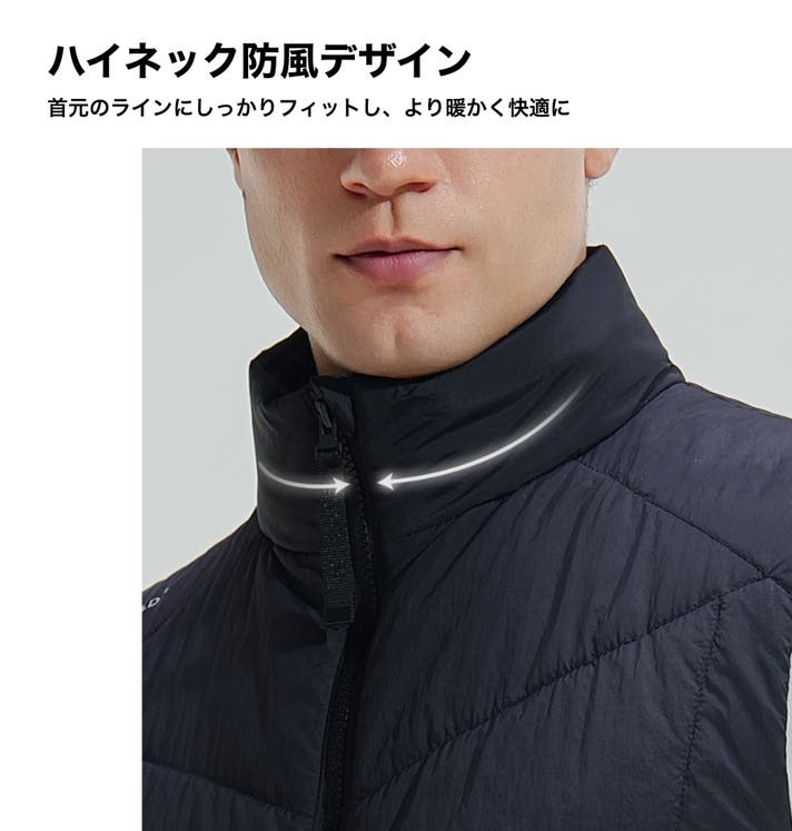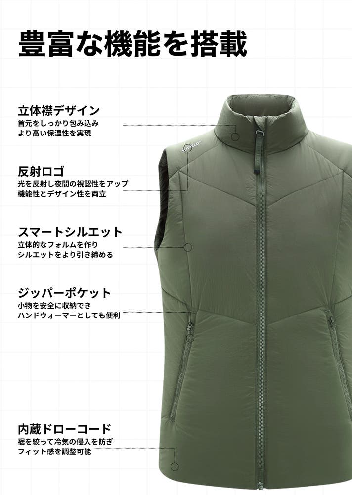 高性能保温繊維と最新開発の「S・KISTLER®エアロゲル綿」を交互に編み込むことで、高い反発力・軽量性・洗濯耐久性を実現!そして遠赤外線蓄熱技術「SPACE HEAT」。この3つの最先端テクノロジーが融合し、“冬でもこれ1枚でアウトドアを楽しめる”次世代の防寒ベスト”を実現しました。