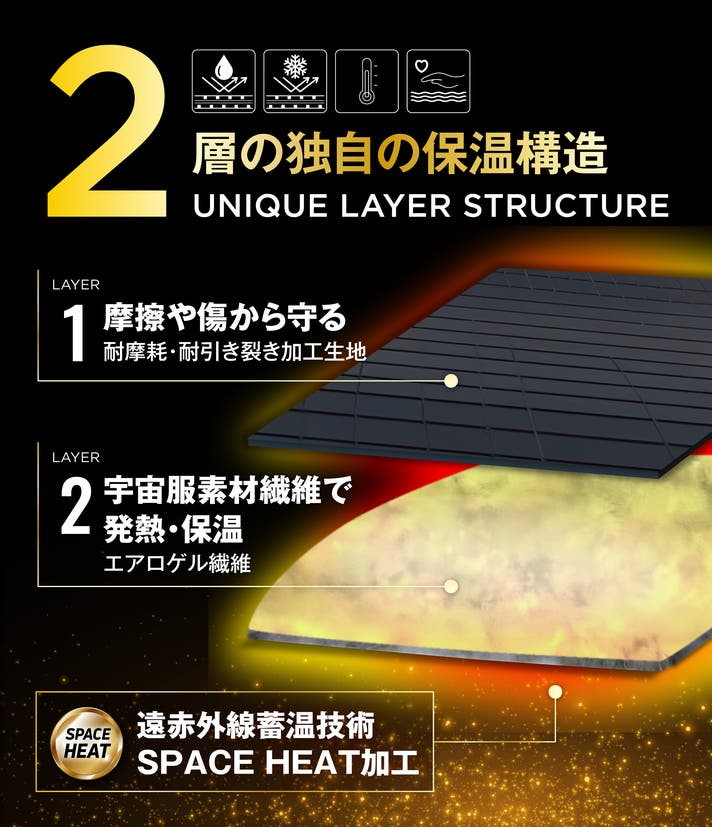 さらにSPACE HEAT技術を採用した生地は、保温性に優れているだけでなく吸湿性も抜群なので、汗をかいても、しっかりと吸湿。快適にお過ごしいただけます。