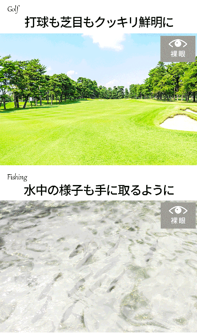 - 裸眼では実現できない見やすさ。偏光度99%、UV99%カット、さらにブルーライト約76%カット