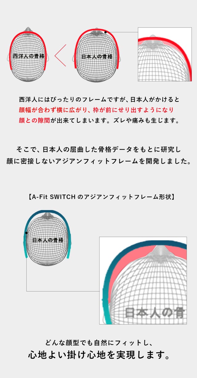 海外製のサングラスを日本人がかけると、レンズが頬に当たったり、締め付け感が強くズレの原因となる場合があります。このA-FIT 2WAY GLASSESは、フレームのフロントカーブを日本人の骨格にあわせて設計することで、快適なかけ心地を実感することができます。