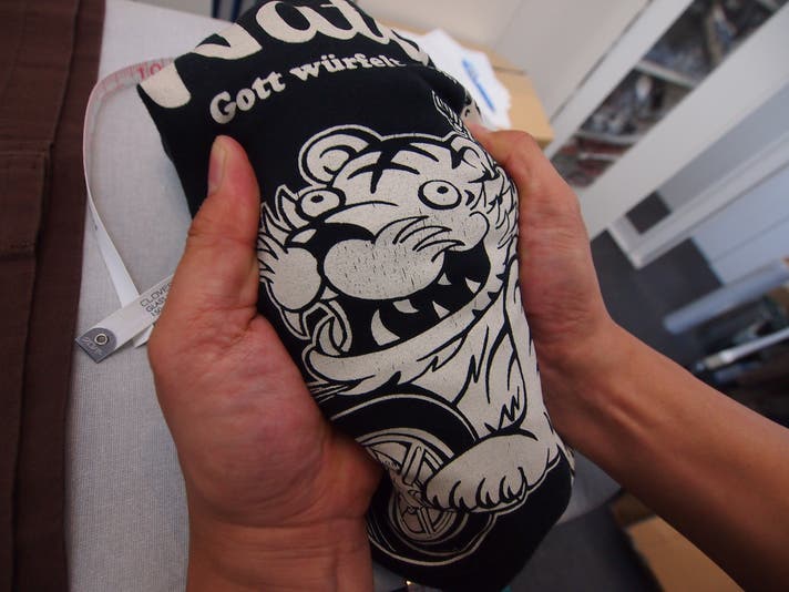▲抜染プリントだと糸そのものに色を染み込ませるので、引っ張っても顔料割れは起こりません。※黒インクのシルクスクリーンプリントも同じクオリティです。