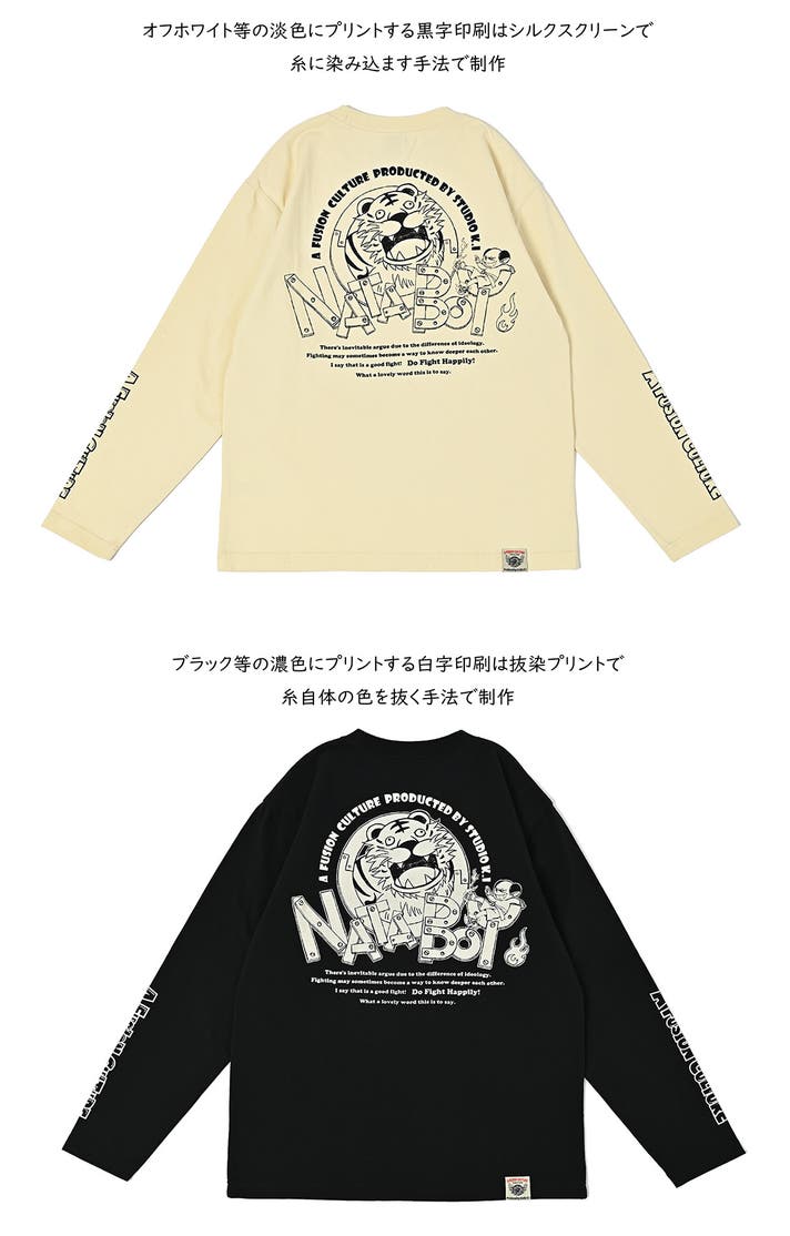 基本的に黒字のプリントはシルクスクリーンプリントでプリントしております。対して白字のプリントは抜染プリントでプリントしております。顔料は生地に馴染む感じに仕上がるように狙って一体感のある手触り、プリント部分でベタっとしたり着用時に蒸れるというのが無いようにこのプリントにしています。また、洗濯などでプリント部分の色落ちや顔料の割れなども避けることも狙っておりますので、洗濯を重ねる場合にかすれていくなど、ヴィンテージ感の味わいを楽しんで頂ければと思います。