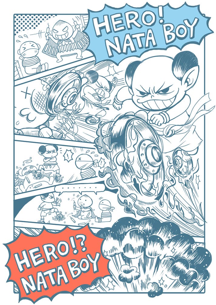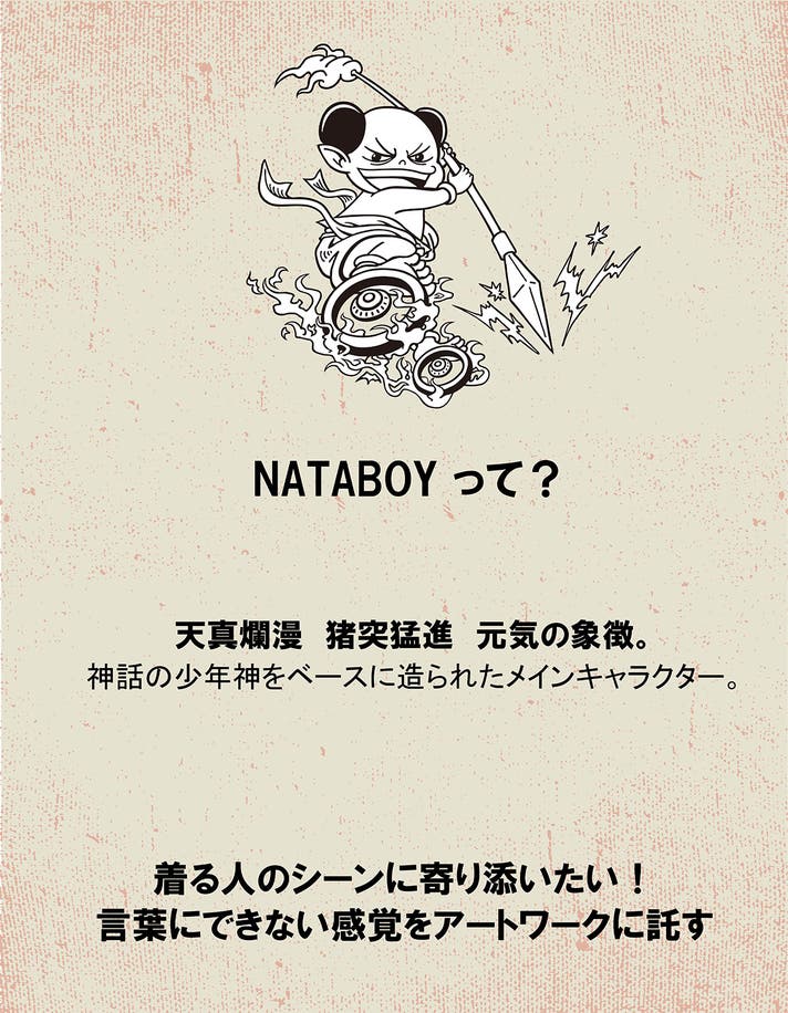 版画や凸版印刷の時代の一色刷りプリントで、ヴィンテージ感を基調にしているが、アートは自由に挑戦することがコンセプトです。NATABOYを主人公にアートワークを拡げる仕掛けを仕込みました。