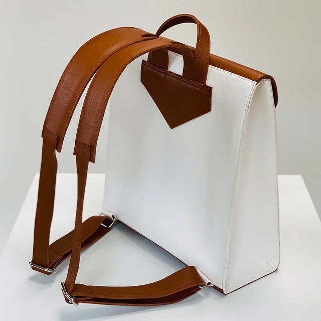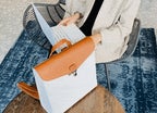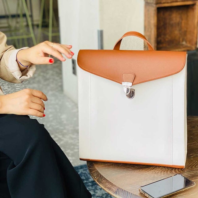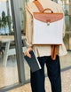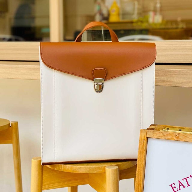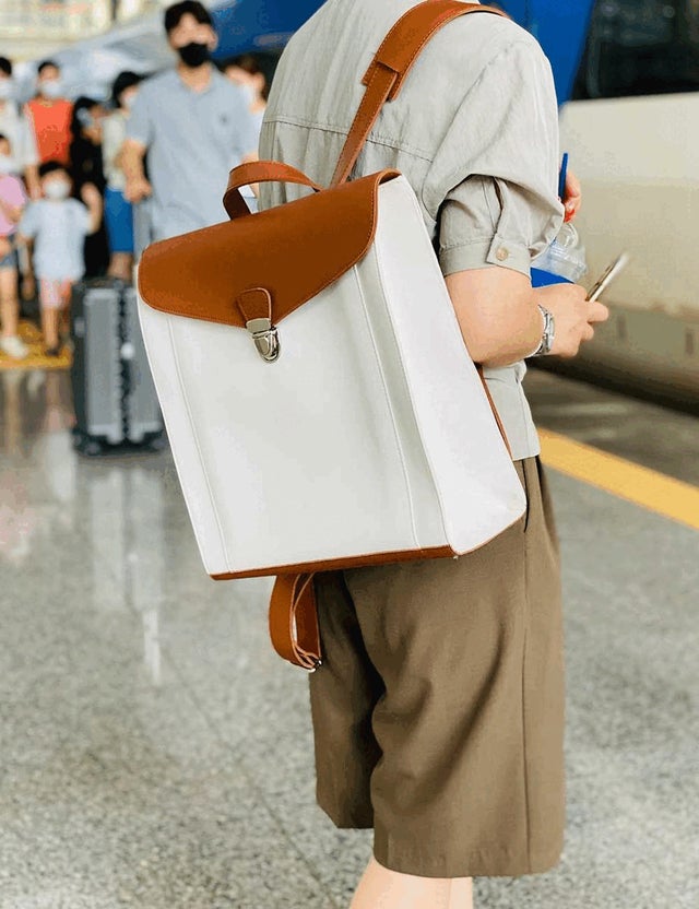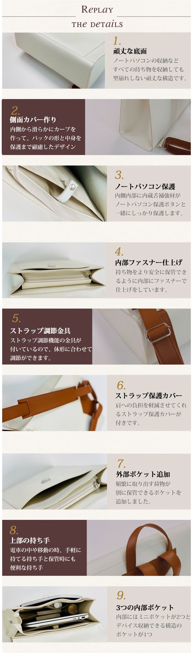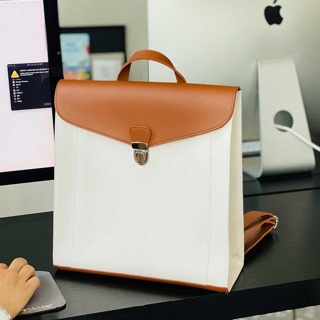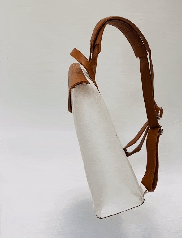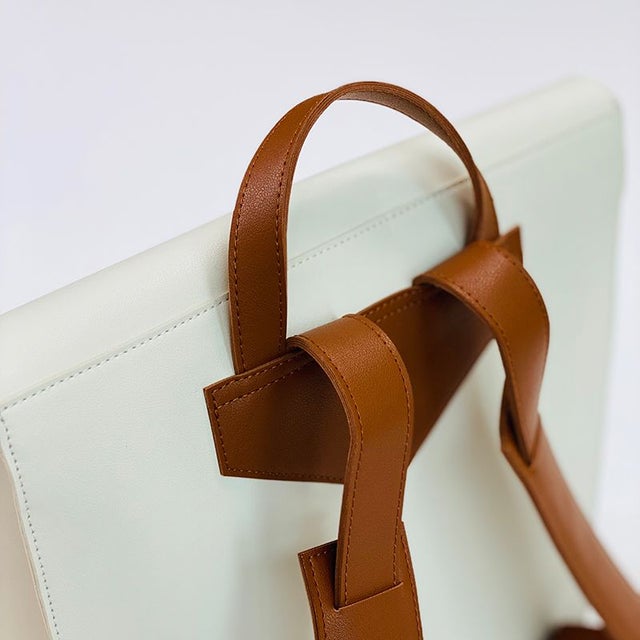 クリームカラーというよりアイボリーに近いベースカラーです。againバックパックのメインカラーとしてベージュカラーがほとんどないホワイトからベージュカラーまで多くのカラーを試してみて、トレンチコートからTシャツ、シャツ、ブラウスまで様々なカラーにマッチングさせながら最も似合うカラーを選びました。