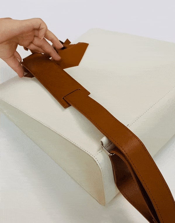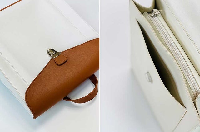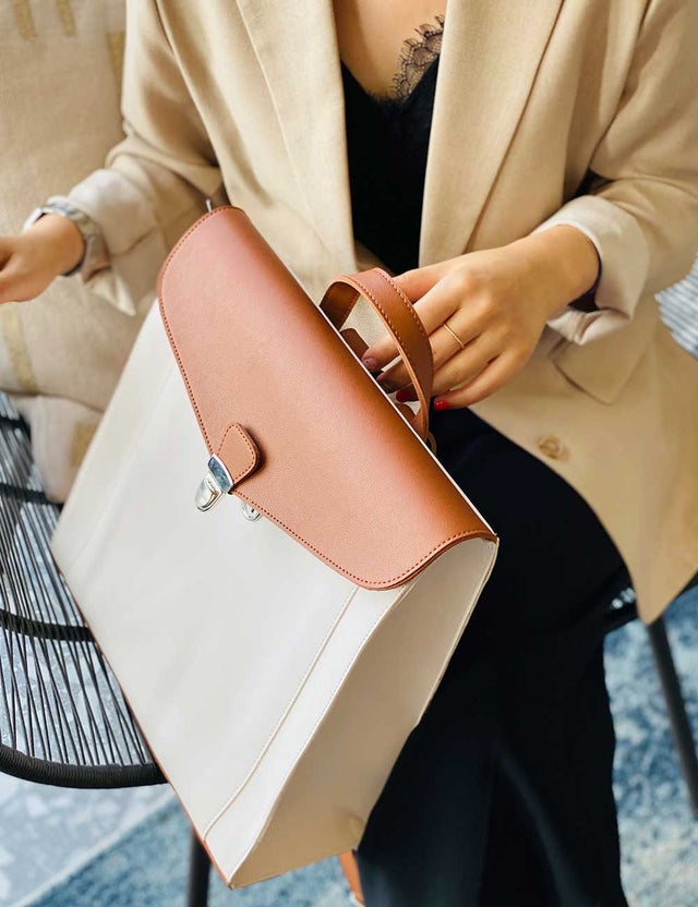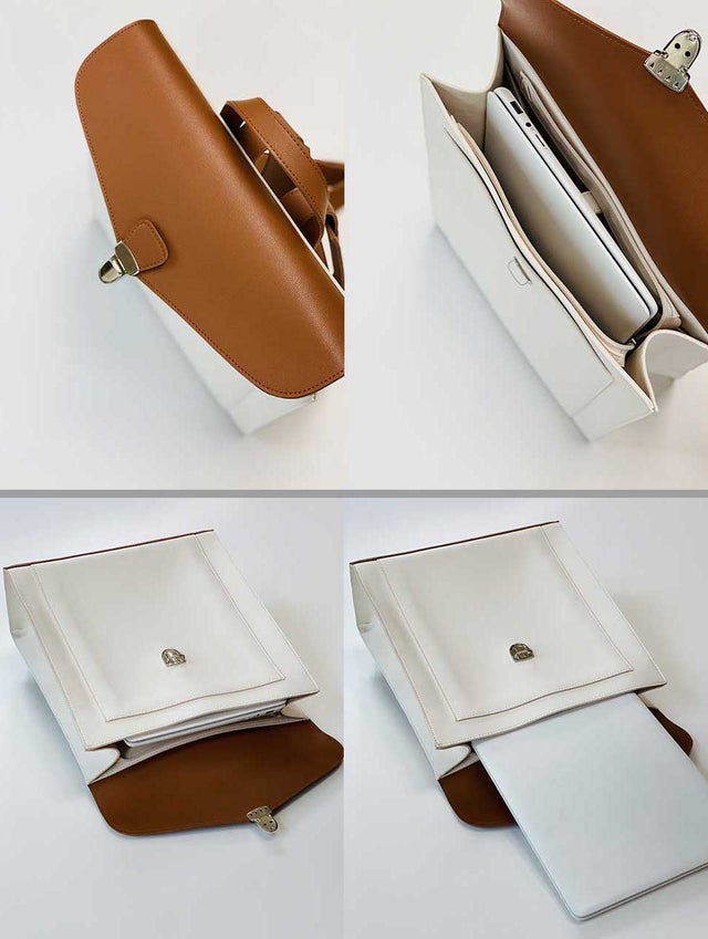 フラップと取っ手、肩紐にキャメルカラーを配色したキャメルクリーム
