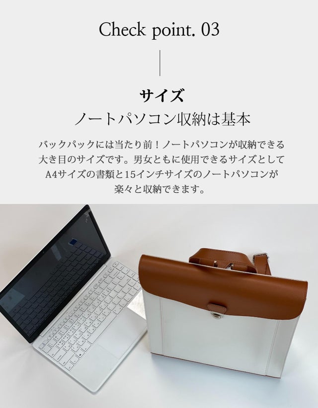 A4サイズのどんな書類も収納できるサイズです。10cmの奥行で厚みを抑えてどんな服装にもシンプルに活用できます。15インチノートパソコンも収納できます。