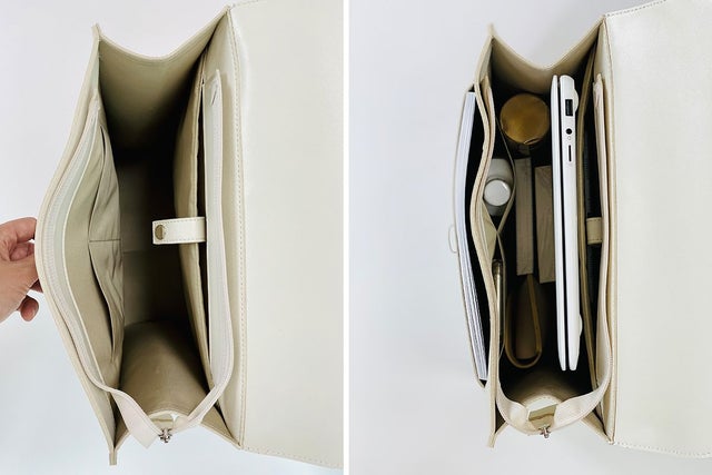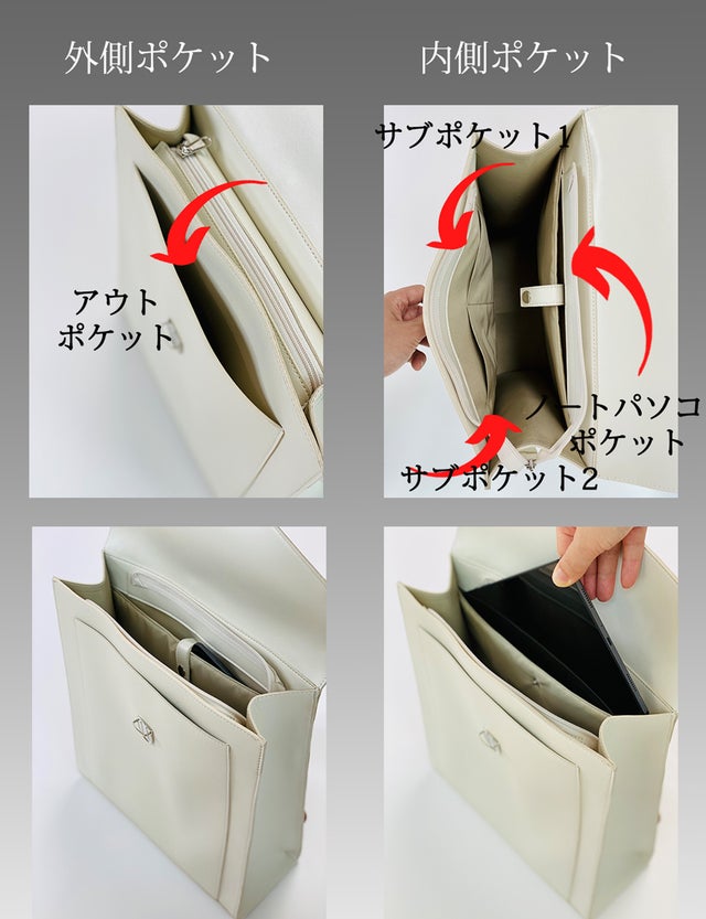 ノートパソコンをカバンに入れてもバッテリー、書類、本、タンブラーまで収納できる構造で使用頻度の高い小物は別に収納できるポケット構成で使い勝手に優れています。
