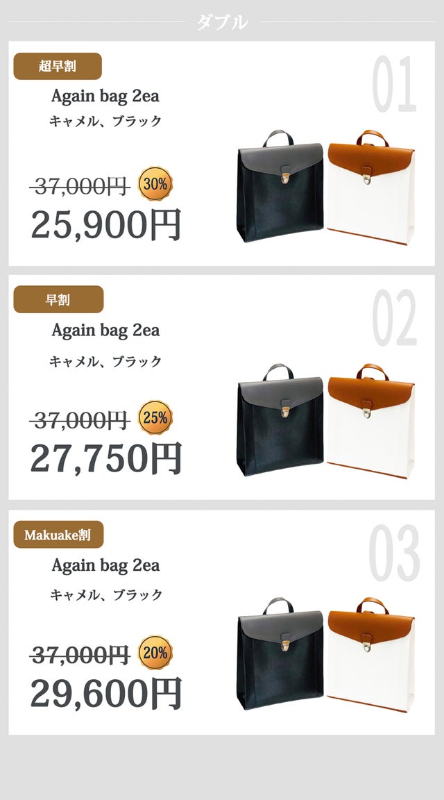 この度はMakuakeサポーターの皆様に日本で初めて「againデイリーバックパック」をご紹介させて頂き、多くのサポーター様にご愛用頂けることを目的でプロジェクをご用意させて頂きました。