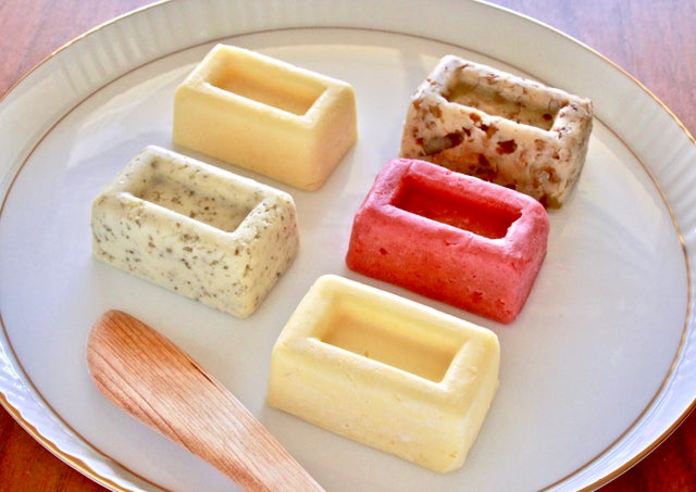 (無塩、ゲランドの塩、フランボワーズ、高知産ゆずと利尻昆布、蕎麦の実と三升漬 各1個)