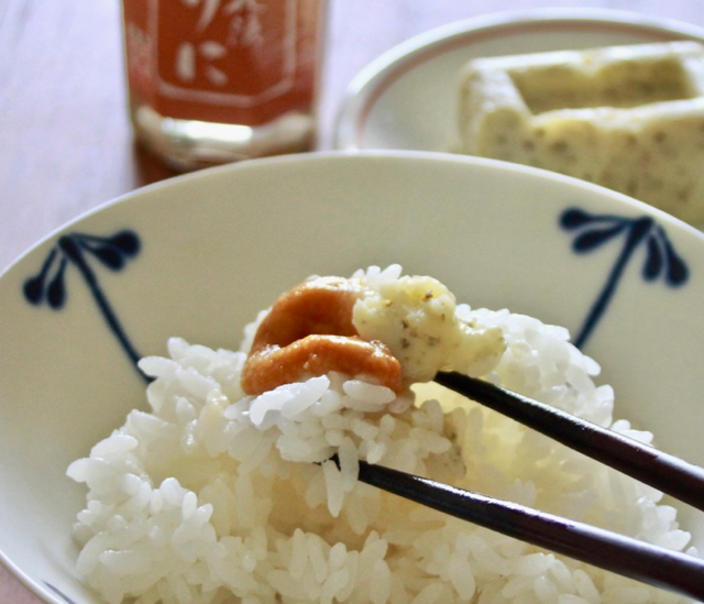こちらはゆずと利尻昆布バターを、北海道のウニの一夜干しと一緒にご飯にON。