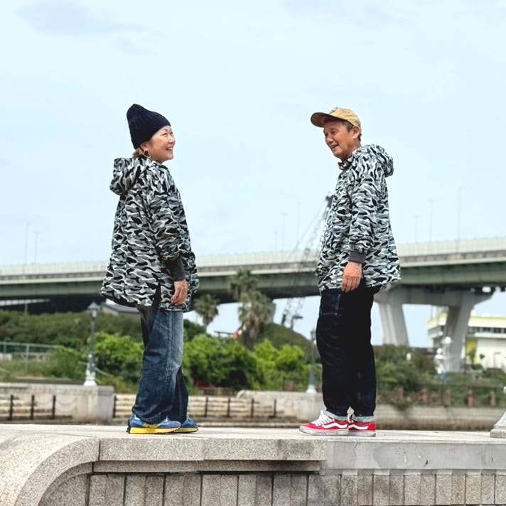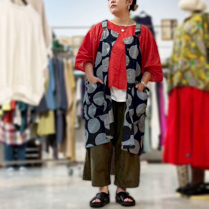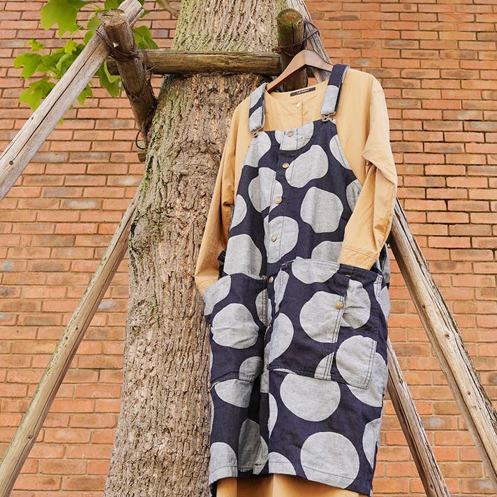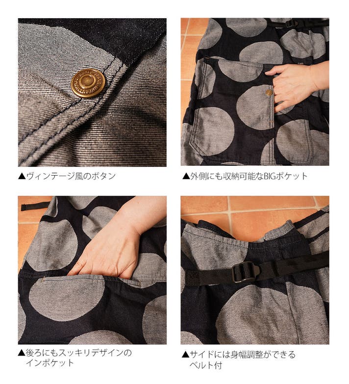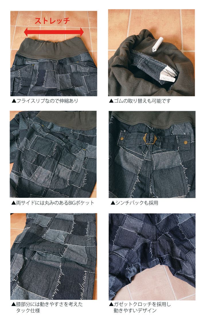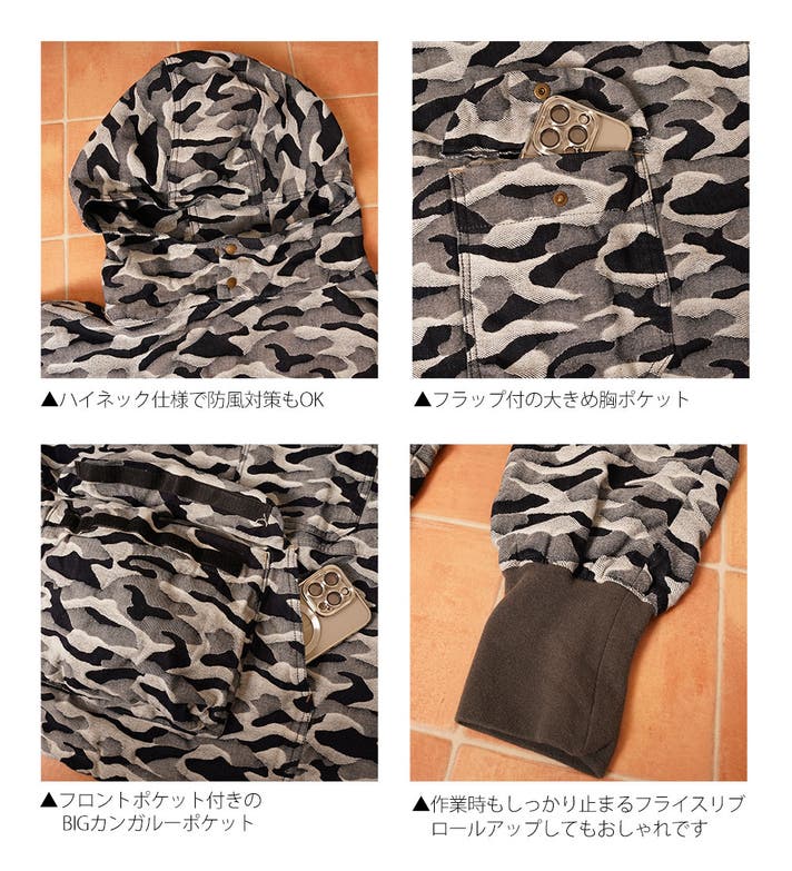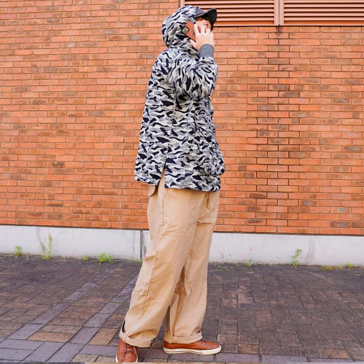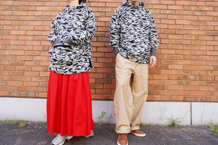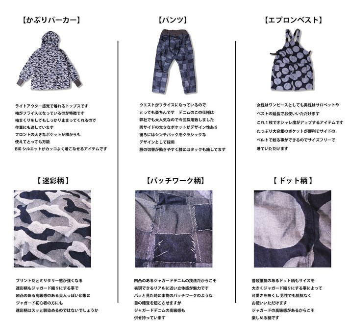今回はたくさんあるジャガード柄の中から悩みに悩んで迷彩、パッチワーク、ドットの3柄、アイテムは、アノラックパーカー、パンツ、エプロンベストを厳選しました!
