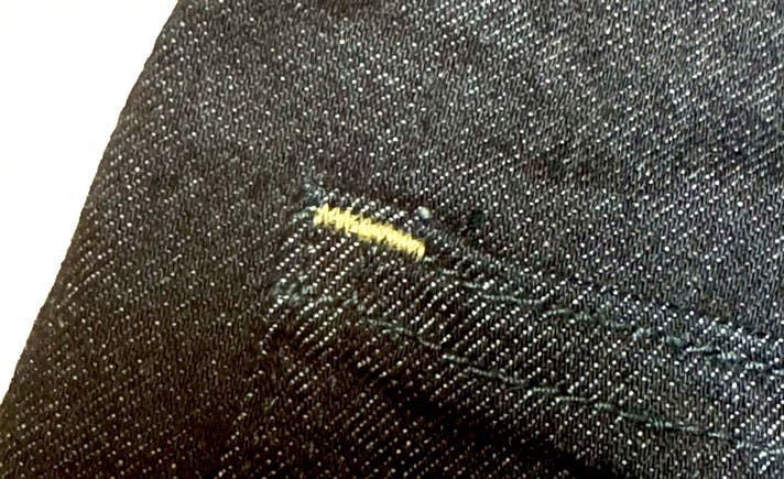 通常はムラが無く中心まで同じ色に染まった糸が良いとされており、ほとんどの糸は中心まで同じ色になっています。しかし、デニム生地で用いる藍染めは他の染料より染まりにくい特徴があります。昔の技術では中心まで染まらず、中心が白い糸でジーンズを作っていました。それが色落ちにつながり、穿き方でアタリが出るデニムらしさとして評価されるようになりました。今の技術では中心までムラなく染めることができますが、あえてヴィンテージ糸を再現した”芯白”という染色手法でアタリが出るデニム生地を作っています。