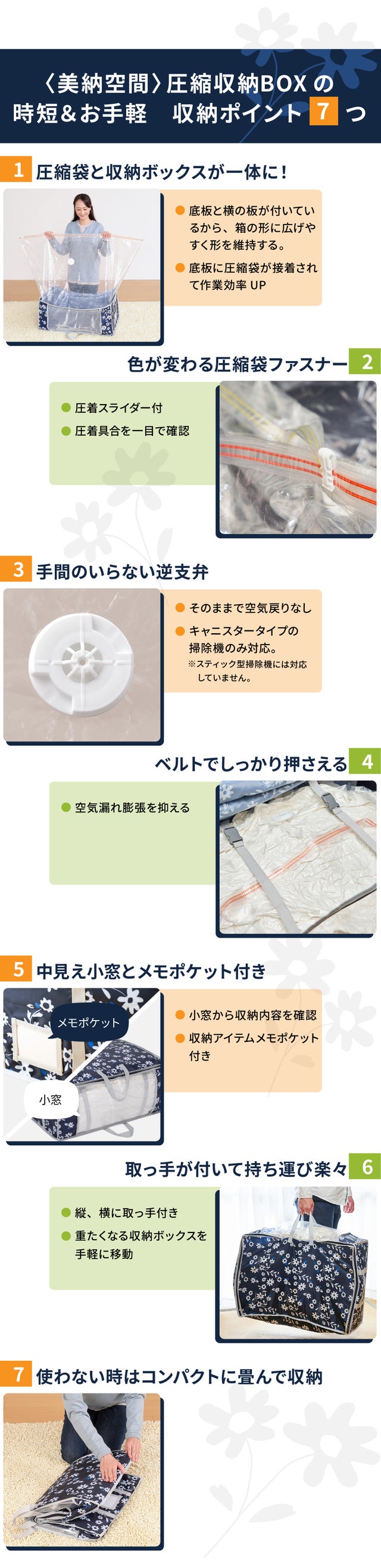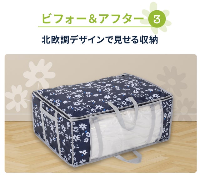 これまでの圧縮収納BOXになかったデザインを取り入れ、見せる収納で使える可愛くおしゃれな北欧調花柄デザインで仕上げました。