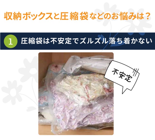 布団、衣類を圧縮して収納できる「圧縮袋」。ビニール製の袋は自立せず、重ねるとズルズル滑って落ち着きません。