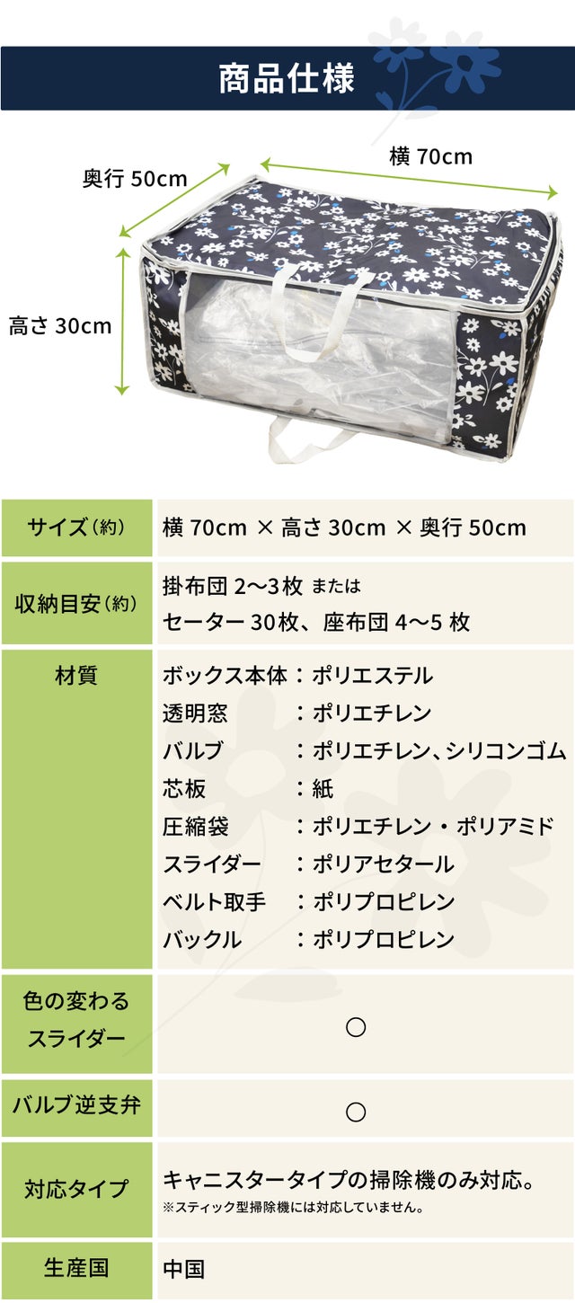 掛け布団は約3枚、衣類約30枚を圧縮して収納することが可能です。