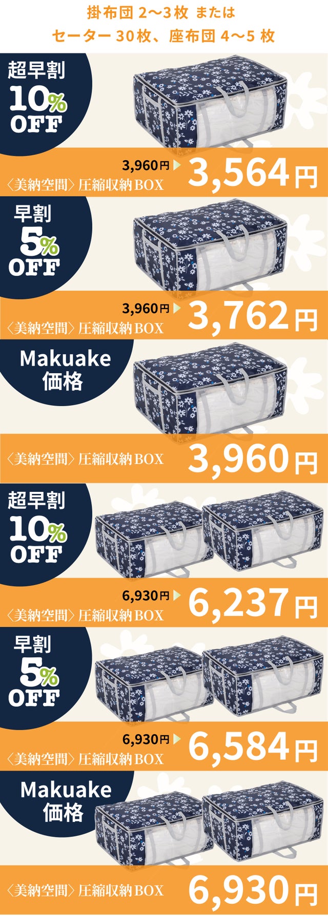 「Makuake(マクアケ)」は、実行者の想いを応援購入によって実現するアタラシイものやサービスのプラットフォームです。このページは、 プロダクトカテゴリの 「〈美納空間〉圧縮収納BOX 布団、衣類があっという間に片付く!おしゃれ収納」プロジェクト詳細ページです。