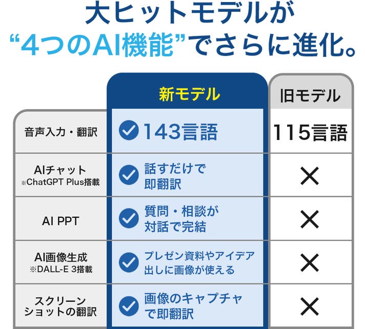 A:新モデルでは、従来の115言語翻訳から143言語に対応、さらにChatGPT PlusとAI PTTとDALL·E 3とスクリーンショット翻訳を搭載しています。
